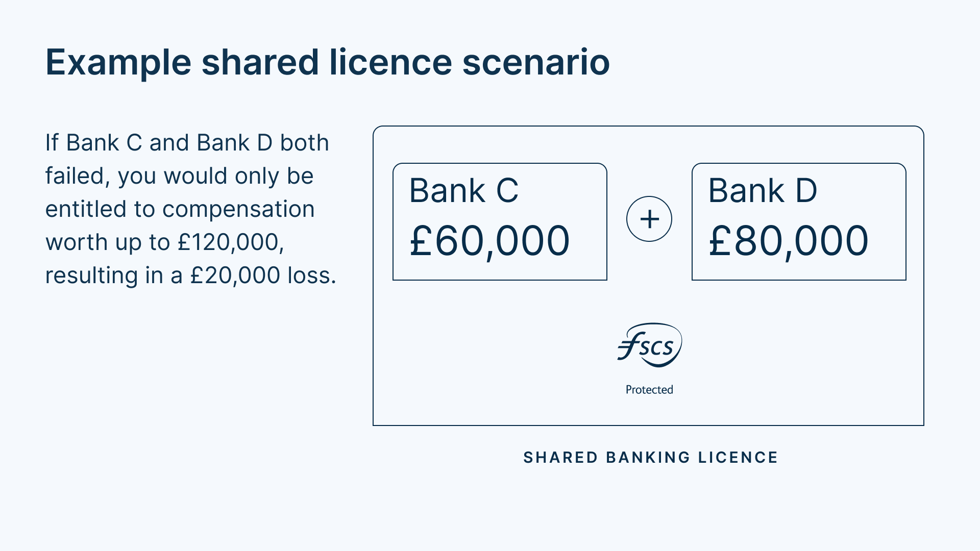 You’re the director of a limited company, and your business has accounts with Bank C (£60,000 balance) and Bank D (£80,000 balance). These banks, while distinct brands, share a banking licence. The banks fail, and because they’re part of the same group, they’re treated as the same bank for FSCS purposes. This means you’d only be entitled to compensation worth up to £85,000, resulting in a £55,000 loss.