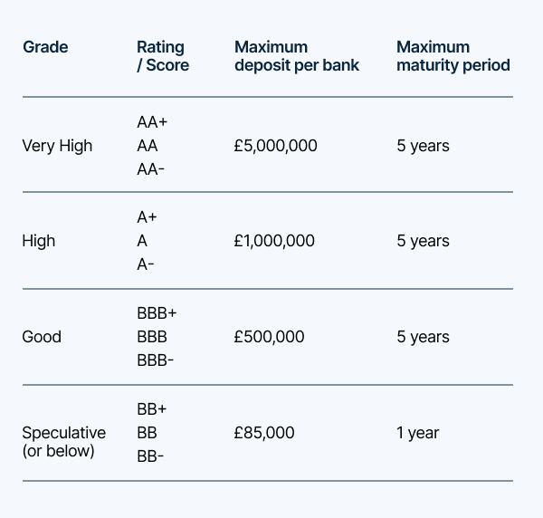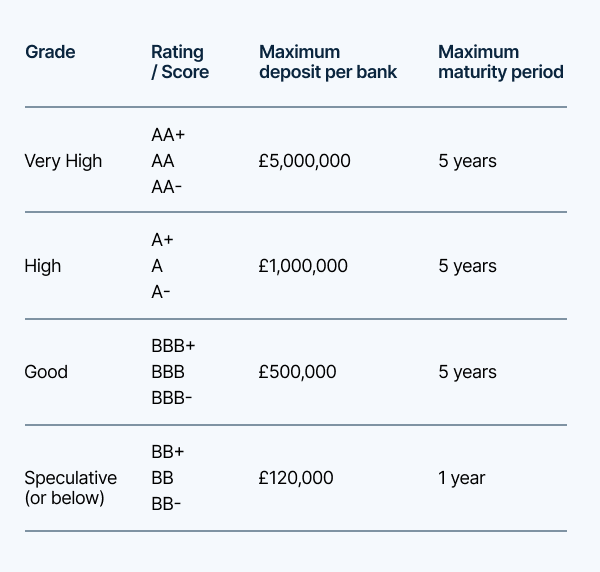 For example, you may want to specify limits on the amount that can be deposited with an approved counterparty, or base those limits on factors such as credit rating, account type, or term length (as shown in the table above).